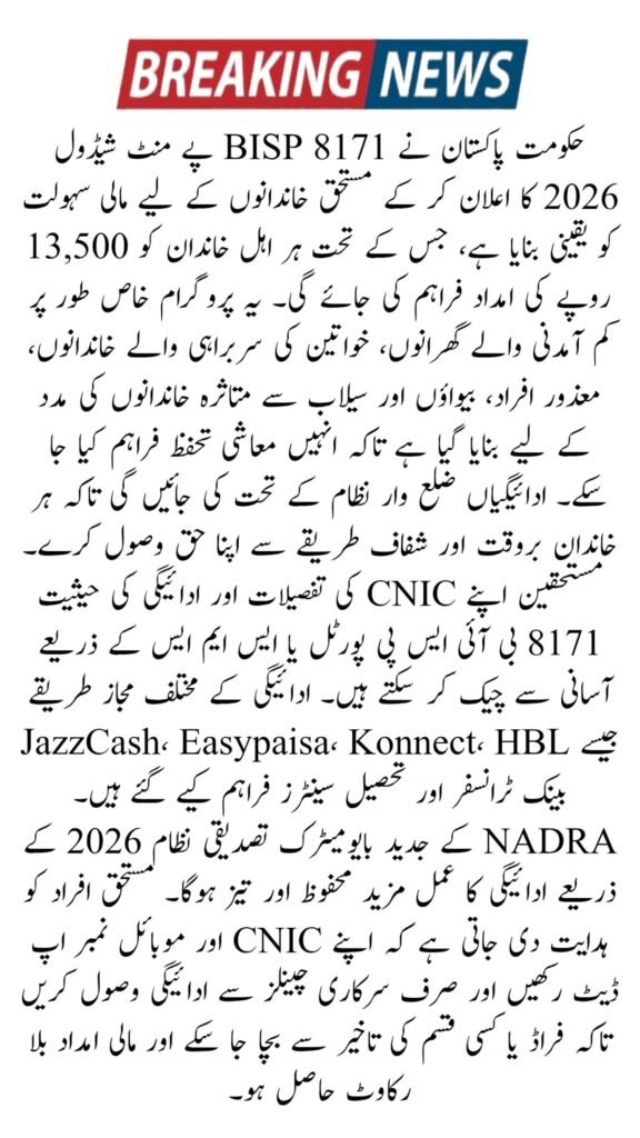The Government of Pakistan has announced the BISP 8171 payment schedule for 2026, offering Rs. 13,500 to eligible families. This program under the Benazir Income Support Programme (BISP) supports low-income households, women-led families, persons with disabilities, widows, and flood-affected communities. Payments are now being distributed district-wise to ensure smooth, timely, and organized collection. Beneficiaries should verify their CNIC and payment status before visiting payment centers. You can check your status on the official portal: 8171.bisp.gov.pk.