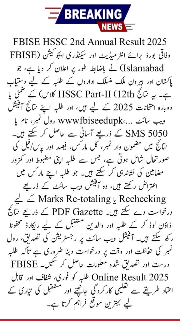 The FBISE HSSC 2nd Annual Result 2025 provides students with a fast, reliable, and user-friendly system to check their academic performance. Whether through roll number search, name search, or downloading the PDF gazette, candidates can access verified results effortlessly. Always rely on the official FBISE website for updates, rechecking notifications, and certificates.
