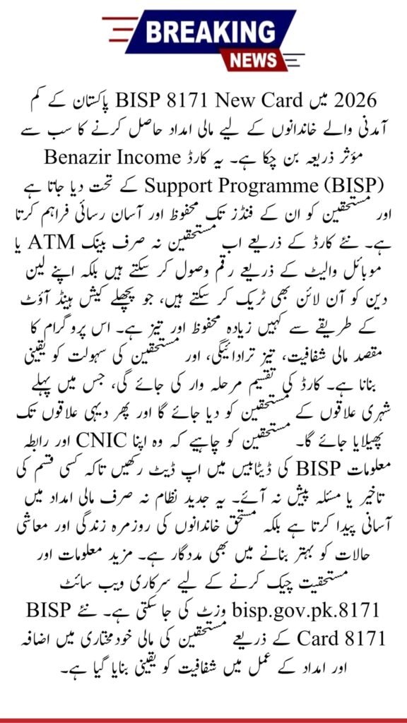 The BISP 8171 New Card Launch 2026 is a major step by the Benazir Income Support Program to modernize financial assistance for vulnerable families in Pakistan. This initiative ensures quicker, safer, and more efficient delivery of government aid. With the new card, beneficiaries will experience digital access to funds, secure transactions, and enhanced convenience, replacing traditional cash distribution methods.