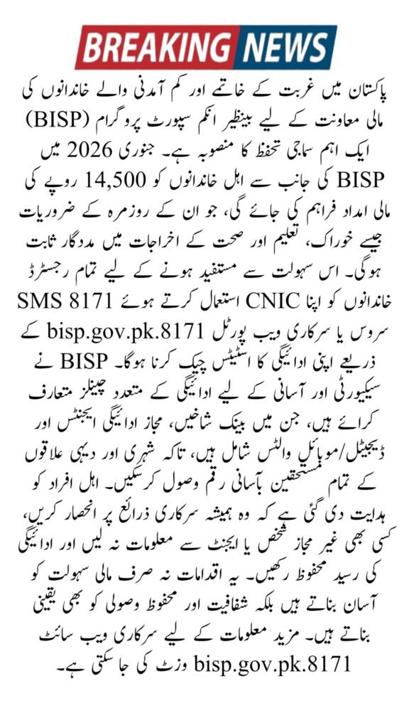 The BISP January 2026 Payment is set to begin in January and will be paid in phases throughout the month so beneficiaries can collect money safely and without large crowds. The amount for registered and eligible families has been increased to Rs. 14,500 per quarter. This information comes from the official website 8171.bisp.gov.pk and trusted Google sources that track BISP news and updates.