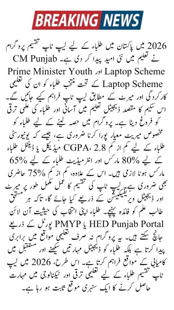 The CM Punjab Laptop Scheme 2026 and the Prime Minister’s Youth Laptop Scheme 2026 are currently distributing laptops to students based on academic merit and performance. This initiative targets university, intermediate, and professional students across Pakistan, ensuring that deserving candidates gain access to modern digital learning tools. Students in Punjab, Sindh, KPK, and Balochistan are now eligible to receive laptops, promoting educational equality and enhancing online learning capabilities. By participating in these schemes, students can upgrade their skills, access e-learning resources, and improve their academic outcomes.