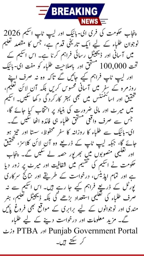 The Punjab Free E‑Bikes and Laptops Scheme 2026 is a landmark initiative that directly addresses student mobility and the digital divide in education. By linking transportation support with digital learning tools, the program empowers students to achieve better attendance, higher academic standards, and stronger career readiness. With merit‑based selection, official portal announcements, and transparent distribution methods, this scheme reflects the Punjab Government’s commitment to youth empowerment and equal educational opportunities across the province. Official updates can be found on the Punjab Government portal: https://www.punjab.gov.pk and the PTBA portal: https://ptba.com.pk