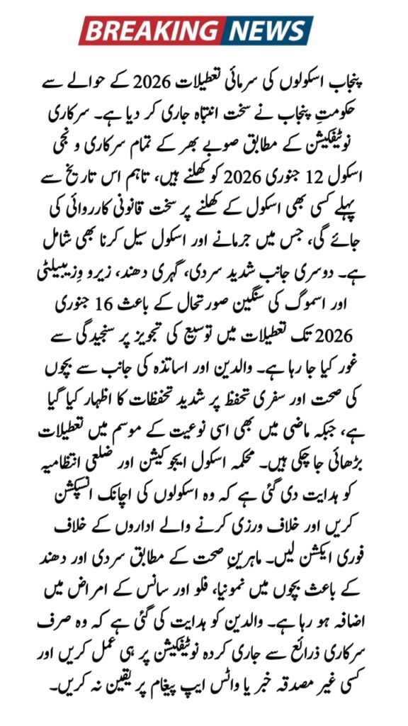 At the same time, due to dense fog, zero visibility, and an intense cold wave, strong indications suggest that the Punjab Government is actively reviewing a proposal to extend winter holidays until January 16, 2026. Parents are strongly advised to wait for the final official notification before sending children to schools.